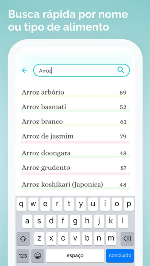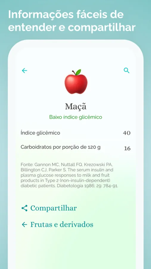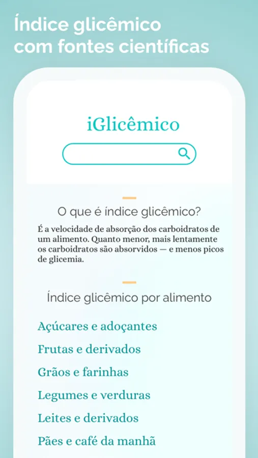 O app permite buscar o índice glicêmico por nome do alimento ou categoria.