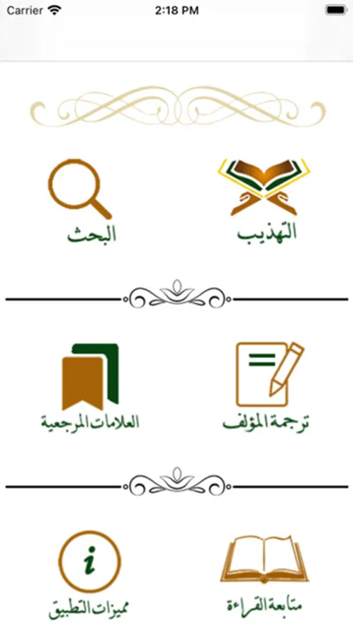 1-صفحة رئيسية يتم من خلالها الوصول للتفسير والبحث وكذلك الوصول إلى العلامات المرجعية ومتابعة القراءة كما يوجد فيها ترجمة للمؤلف .