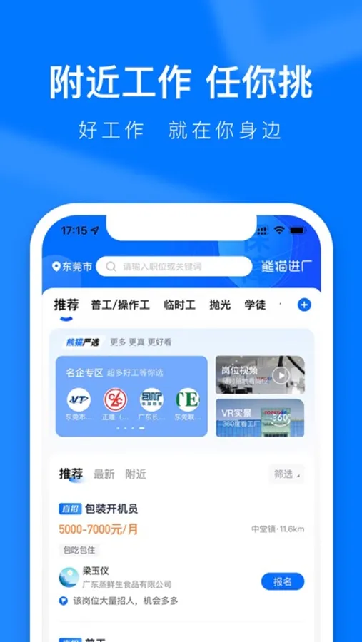 熊猫进厂,一款为蓝领工人求职量身定制,你关心的到手工资、厂区及周边环境、附近好工作才是我们最关心的,高效匹配、定位、科学比对...只为更懂你!