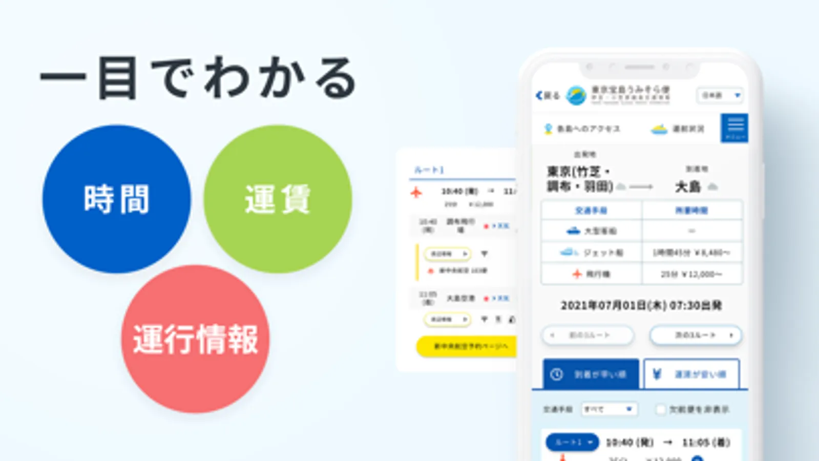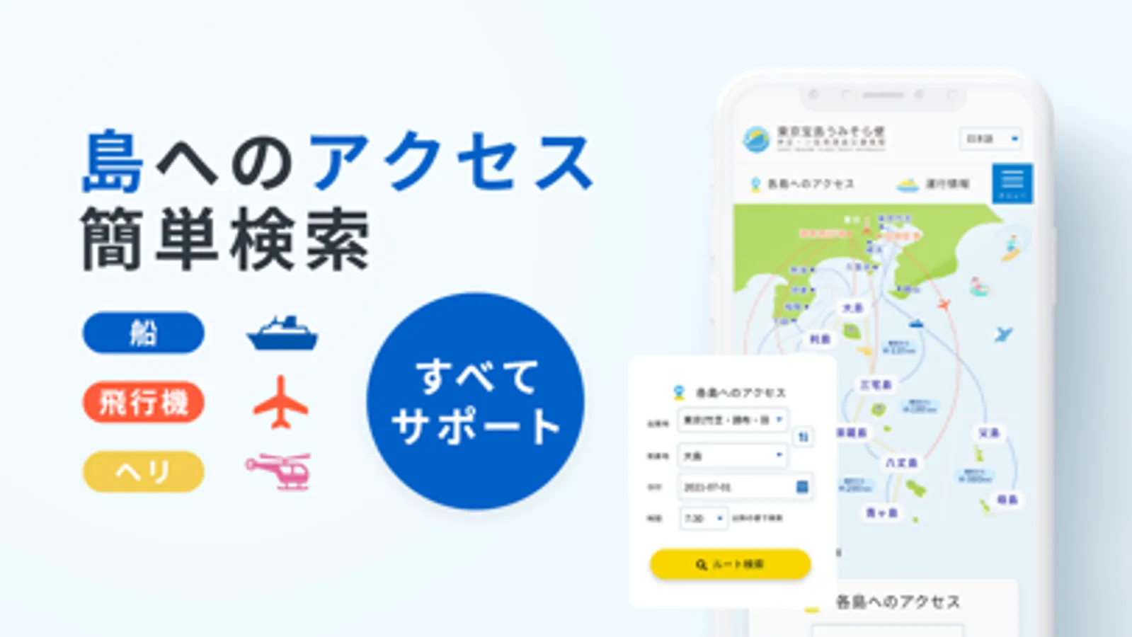 伊豆諸島・小笠原諸島へ航行する大型船、ジェット船、フェリー、飛行機、ヘリコプターなど各交通手段を一括で検索できるアプリです。