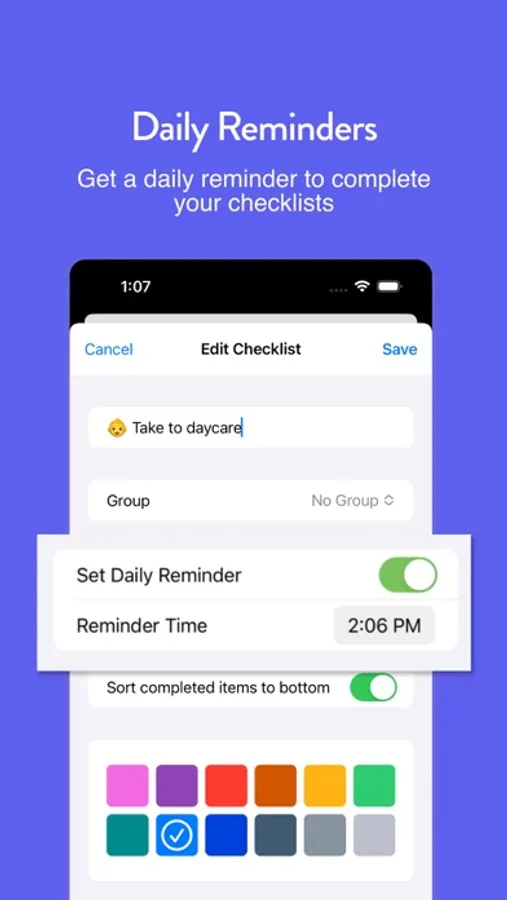 Set a daily reminder for each checklist that will remind you at a specific time each day.