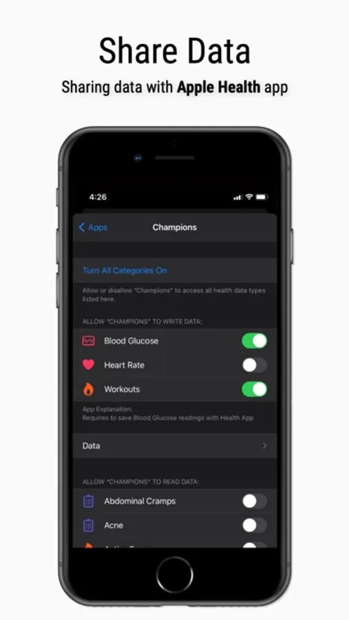 Champions app can activate some popular sensors and help you share the glucose readings with the healthKit by enabling the option in settings. Users can see his glucose levels in healthKit.