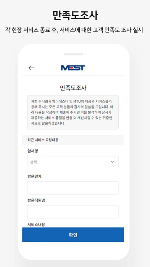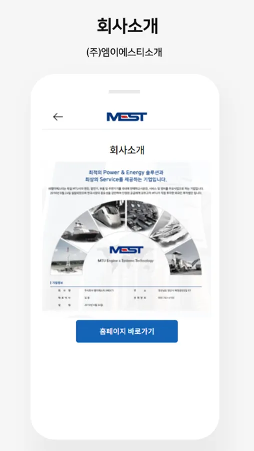 (주)엠이에스티는 독일 MTU사의 엔진, 발전기, 부품 및 주변기기를 국내에 판매하고 시운전, 서비스 및 정비를 주요사업으로 하는 기업이며, MTU가 직접 투자한 외국인 투자법인입니다. 제품의 진정한 우수성은 양질의 사후 서비스를 제공함으로써 비로소 현실화 시킬 수 있다는 신념을 바탕으로 제품에 대한 서비스 제공과 고객만족에 심혈을 기울이고 있습니다. 제품의 최초가동, 시운전 모니터링, 커미셔닝에 이르기 까지 장비 최적화의 전 과정을 항상 함께 해 드립니다. (주)엠이에스티의 서비스 목표는 고객의 제품이 언제나 공정상에 최적화 된 성능을 상시 유지하실 수 있도록 지원해 드리는 것입니다.