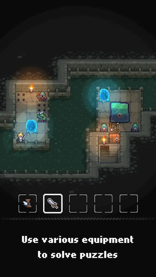 Dungeon and Puzzles is a game that challenges players' 2D spatial perception and logical thinking. A player can use a sword to attack monsters, or a bow and an arrow to destroy enemies from afar. Pushing the obstacles back with a shield and pulling the monsters with a pair of special gloves.