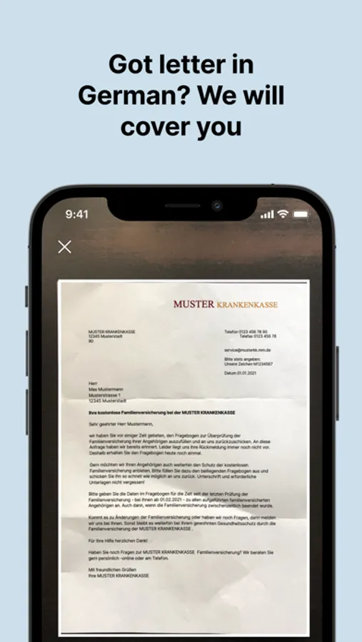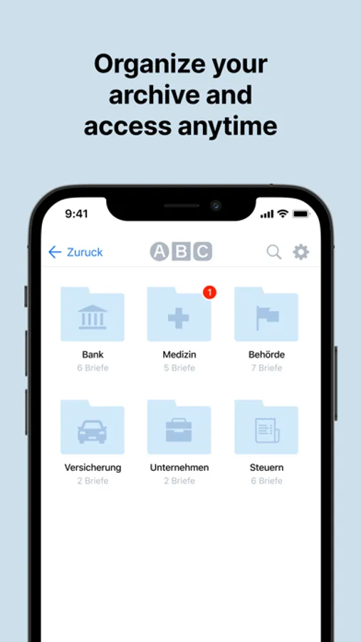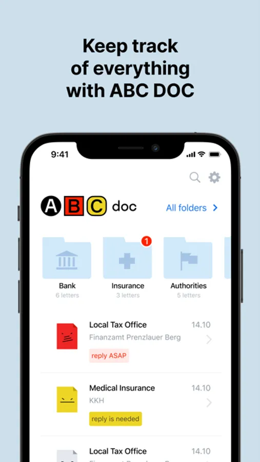 ABC DOC helps you deal with German official correspondence. Scan a paper letter with ABC DOC and submit it for recognition. ABC DOC's Artificial Intelligence will recognize it and tell you what it is about in simple and understandable words, and also give recommendations on what actions you should take.