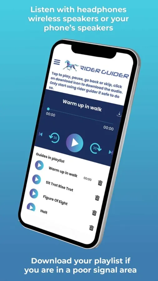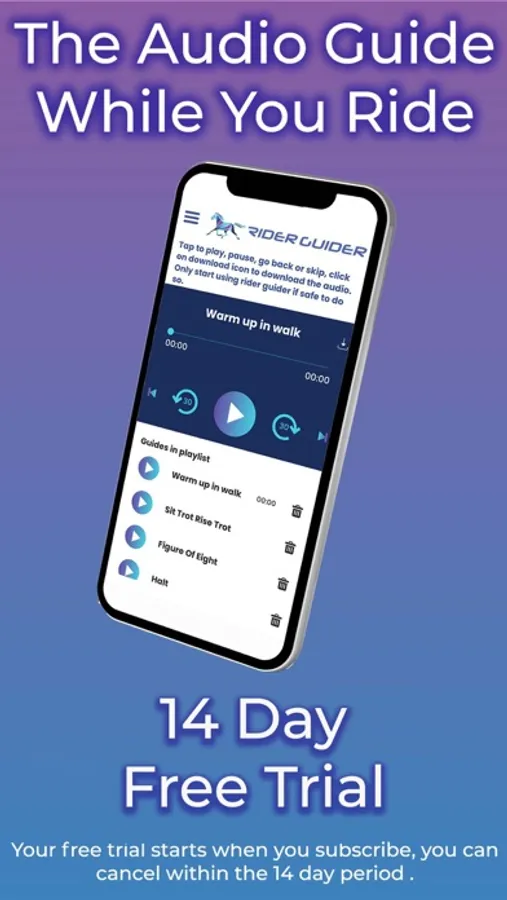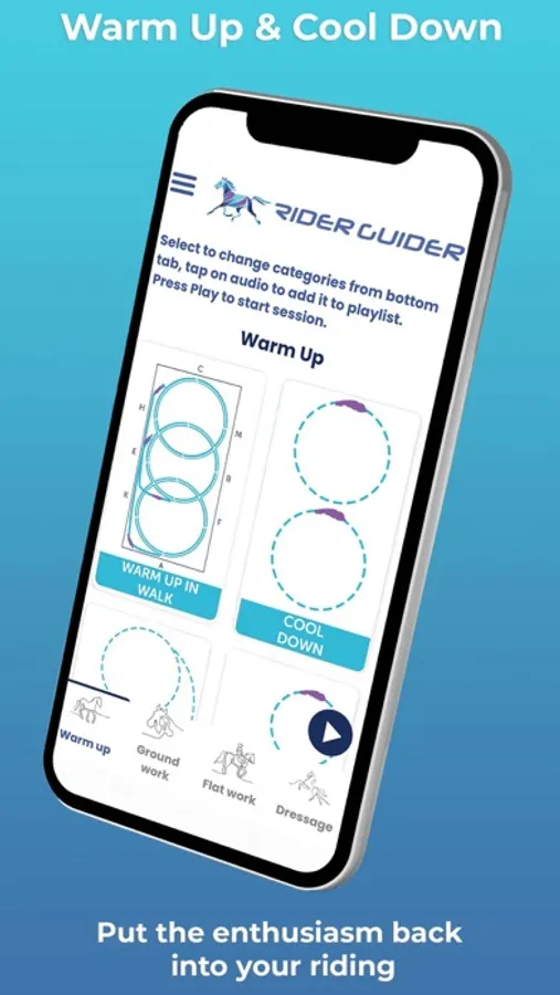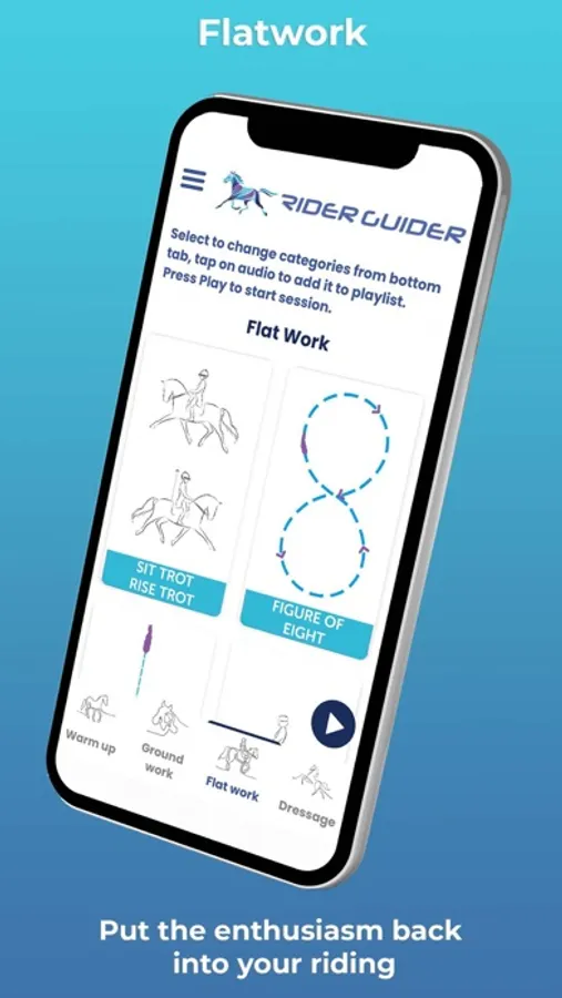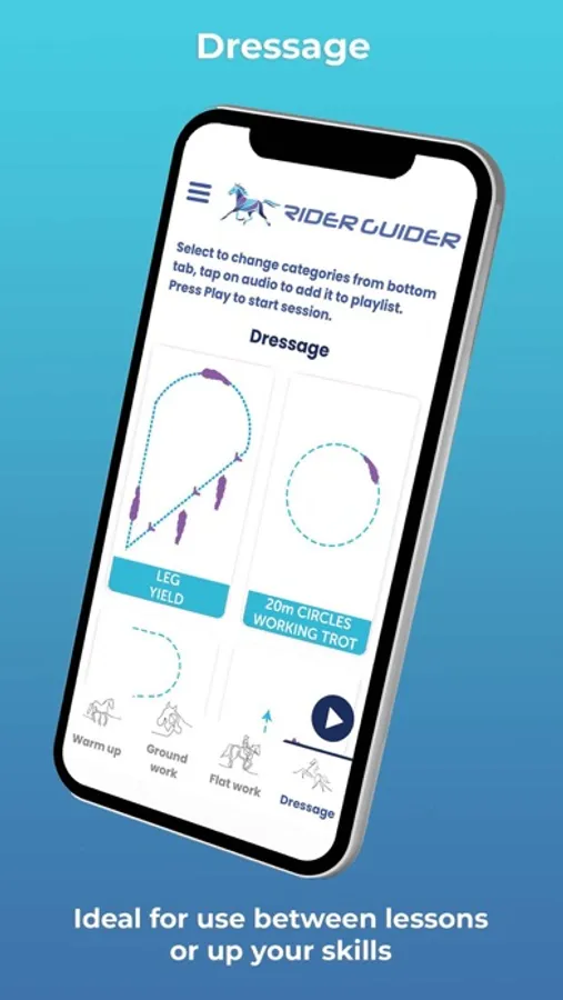 Let Rider Guider put the enthusiasm back in your horse riding sessions. Do you and your horse need a training boost? Do you find yourself wandering the arena lacking focus and inspiration? Could your schooling sessions with your horse be more productive? Rider Guider is a unique equestrian App for horse riders and horse training, allowing you to listen to horse riding audio lessons while you ride.