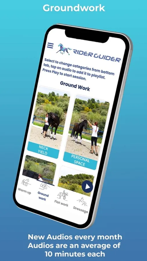 Create your own personalised playlist of informative audios to listen to as you ride. Choose from Warm-ups, Groundwork, Flatwork or Dressage, simply select the audios you want and bring some new motivation into the arena!