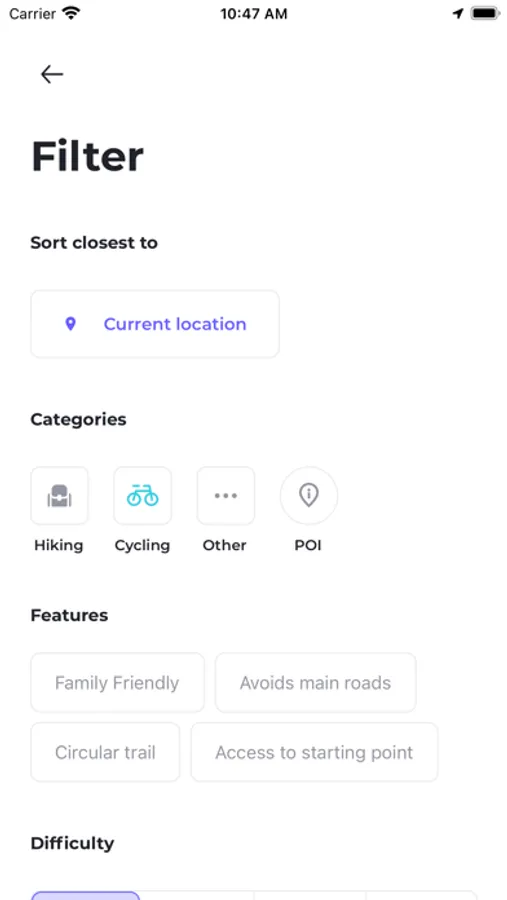 - You can filter trails by difficulty level, duration, distance, family friendliness, circular trails, and more.