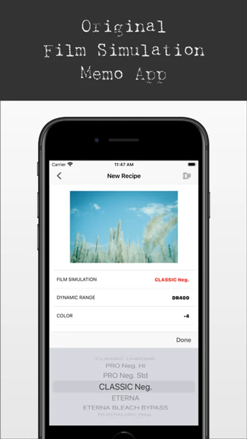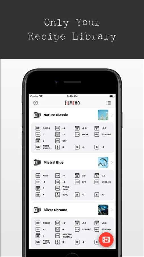 FILMEMO is an application for FUJIFILM camera users. You can write down and save an unlimited number of your original film simulation settings.