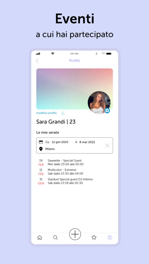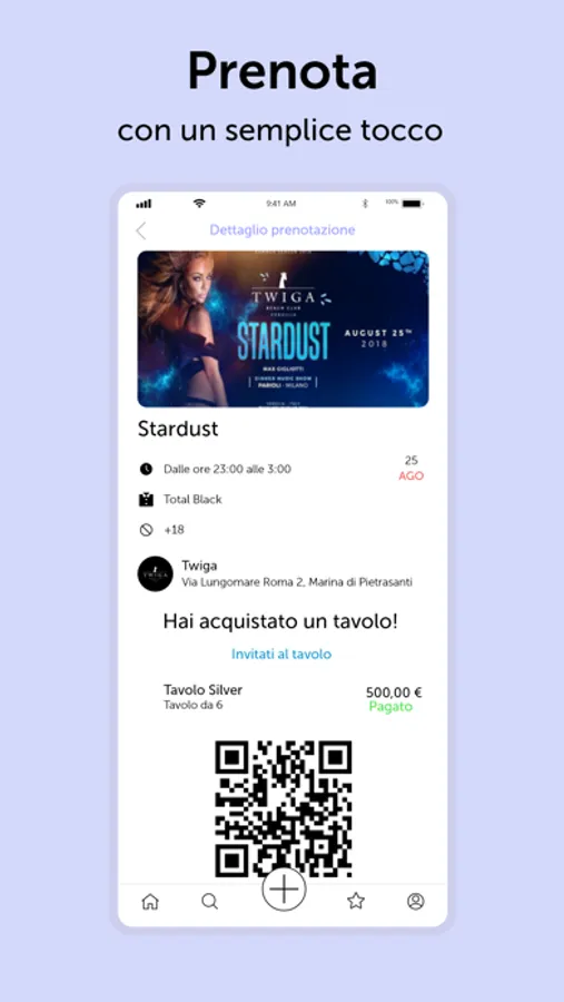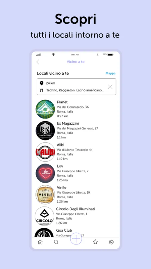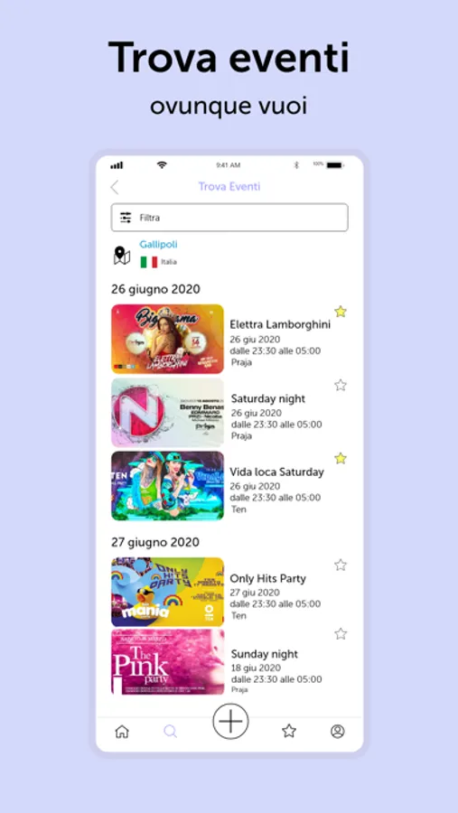 Cerca l'evento che fa per te in base alle tue preferenze. Seleziona il raggio di Km da te, scegli i generi musicali che ti interessano, visualizza i dettagli dei prezzi di liste, biglietti e tavoli e prenota con facilità.