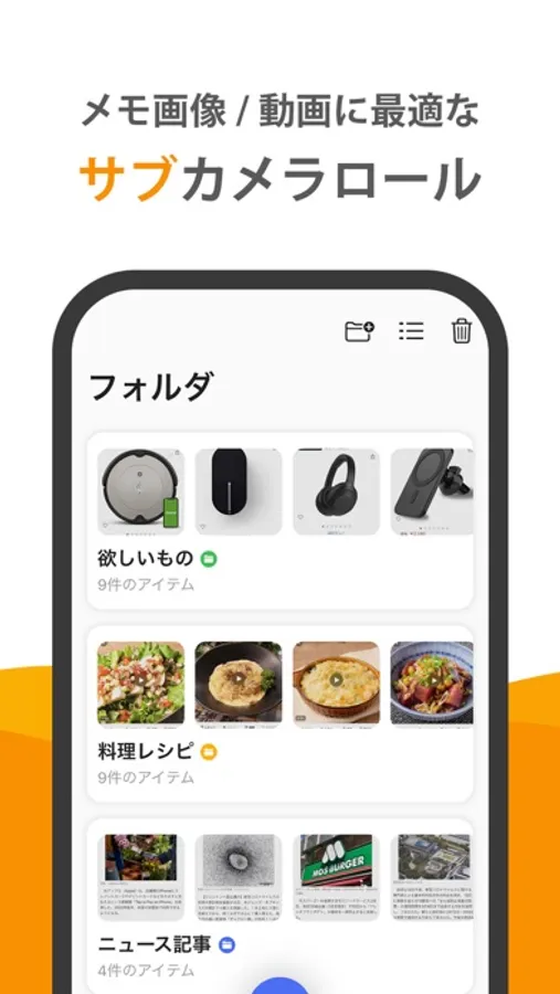Picmemoは、カメラロールに埋もれやすい料理レシピやニュース記事などのスクリーンショットや参考のために残しておいた画像や動画などを管理するためのサブカメラロールアプリです。