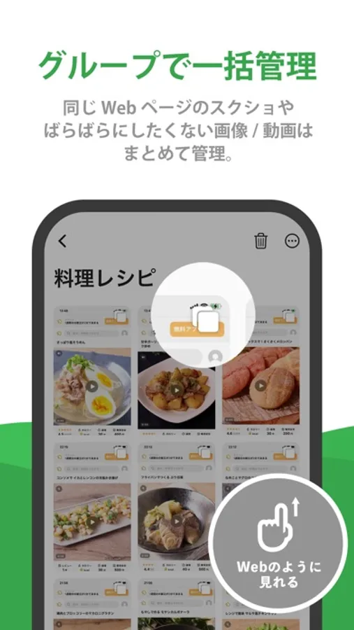 Picmemoには「グループ」という機能があり、同じWebページで撮られたスクリンショット画像やテーマの同じ画像や動画を1つにまとめられる機能があり、みやすく管理することができます。