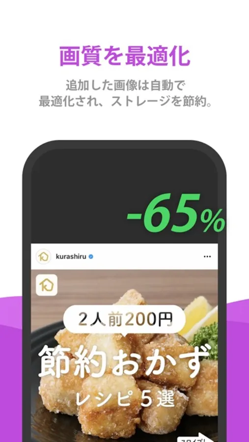 アプリに追加した画像は見た目をほとんど変えることなく自動で画質を最適化されます。これにより元の画像サイズをマイナス65%にすることもでき、スマホのストレージを節約することができます。