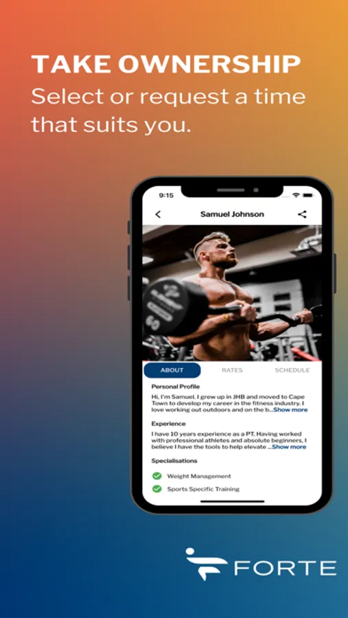 Forte aims to connect Athletes with Specialists in their preferred discipline through our easy to use mobile application. By allowing athletes to search, book, pay and review specialists with each and every transaction, we’ve created a central marketplace for the specialist wellness and fitness industry.