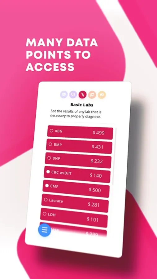 This app is designed for early clinicians to practice using diagnostic testing to arrive at a simulated patient's diagnosis. Patient histories are provided - the goal of playing is to choose diagnostic tests to get to the right diagnosis as efficiently as possible.