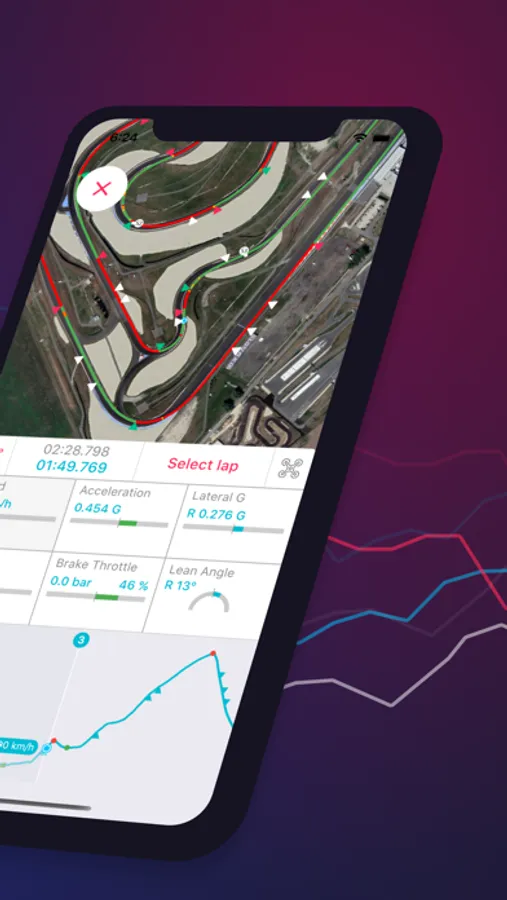 - Visualize the lines and analyze each lap to see why you’ve been fast or slow in a particular part of the track. You can analyze speed, acceleration or deceleration, gas and brakes application, RPMs, gear change, lean angel for motorcycles, temperatures for Go-Karts, as well as your line on the map.