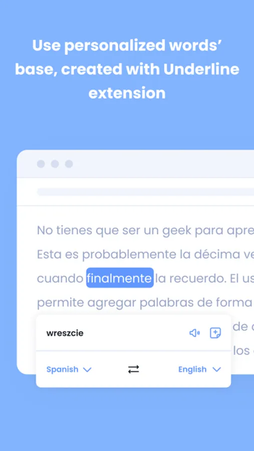 By combining two compatible tools - a mobile application and a browser plug (extension), Underline combines the process of searching, translating, saving, and learning words, which allows you to learn the vocabulary you really need.