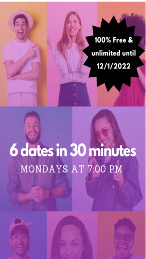 Date Night is half an hour of 5 minute video dates every Monday night at 7 pm. You tell us what you’re looking for, and we’ll pair you up with up to 6 different people. It’s a pressure-free way to get the most out of your dating life.