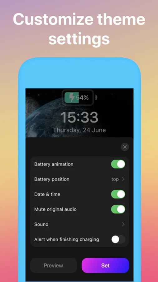 > Theme settings: sound, battery, date & time, alert when charging finishes