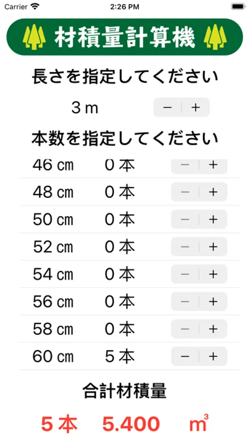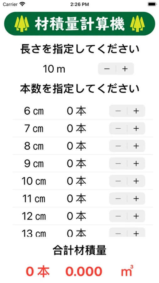 伐採した材木の長さと太さ別の本数を入力すると、合計の本数と材積量が表示されます。