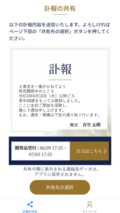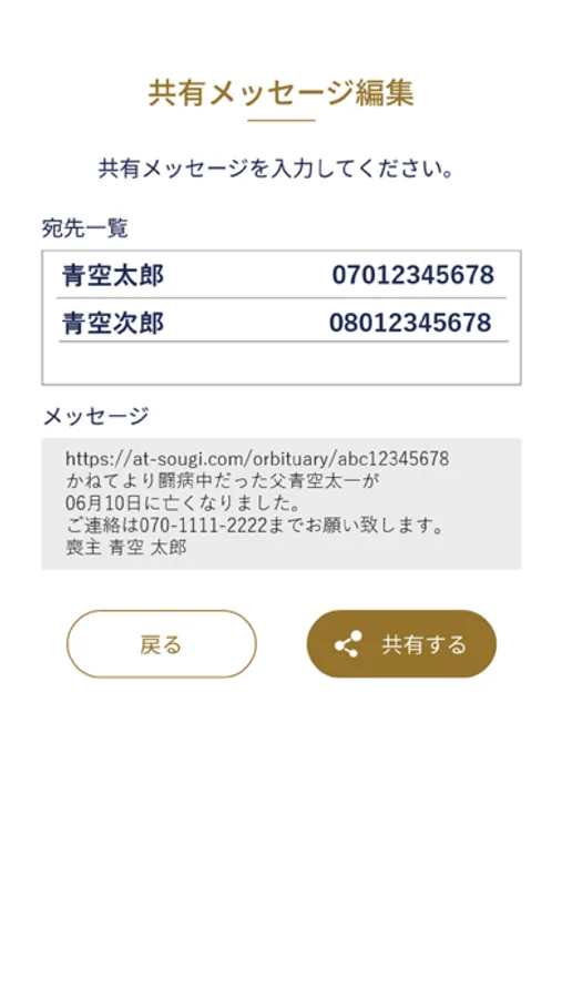オンライン葬儀サービス アット葬儀(@葬儀)で事前に作られた訃報案内の共有アプリです。このアプリによって、訃報案内をより簡単に、SMS(電話番号で送れるショットメッセージ)で共有することが可能です。