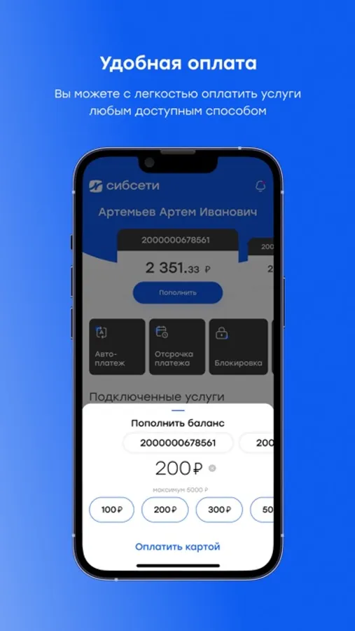 Оплата. Возможность быстро оплачивать ваши услуги банковской картой, Apple pay или Google pay, легко переключаясь между лицевыми счетами.