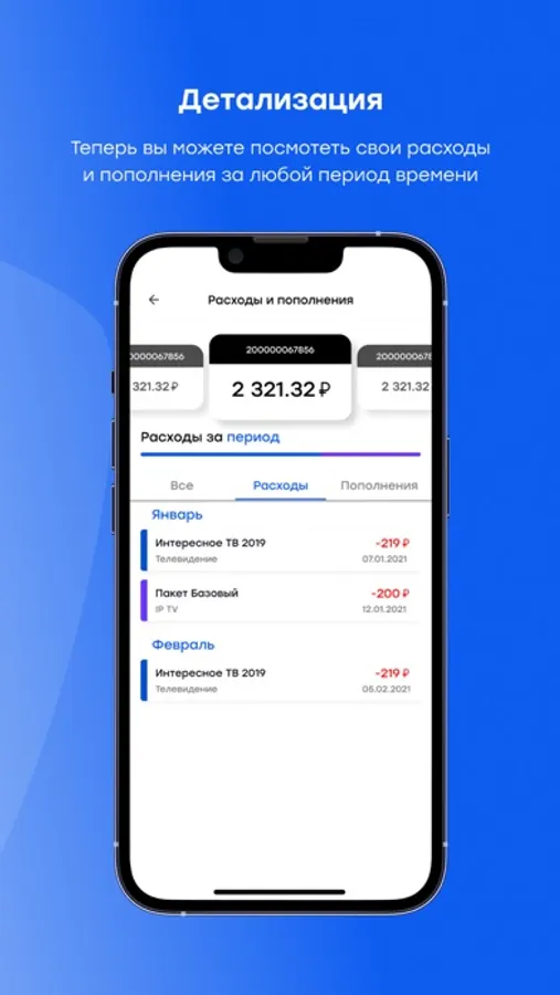 Детализация. Легко ориентируйтесь в расходах и пополнениях за нужный период и быстро переключайтесь между лицевыми счетами.