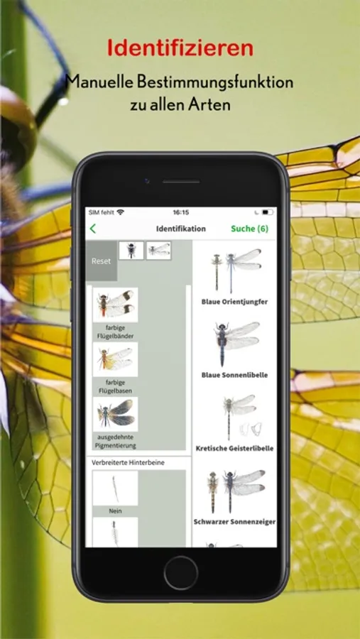 Die einfach zu bedienende manuelle Bestimmungsfunktion macht es auch für den Laien spielend einfach möglich eine Libelle bis zur Art zu bestimmen.
