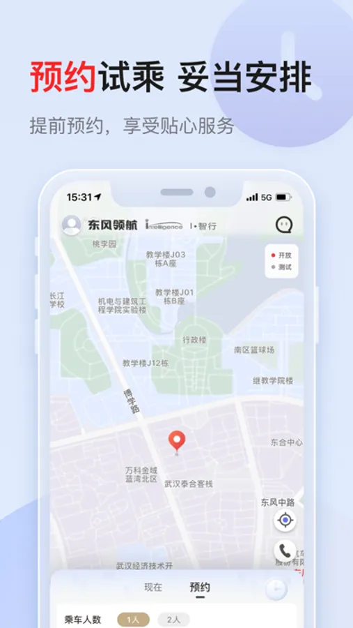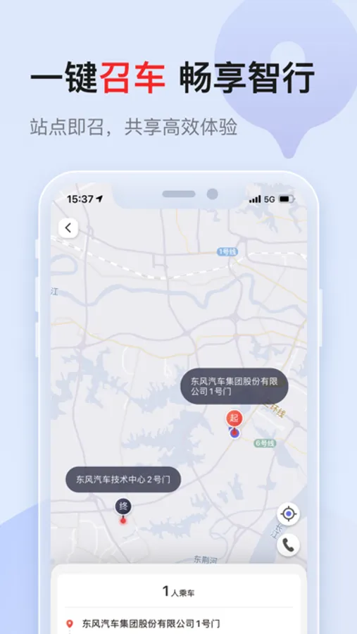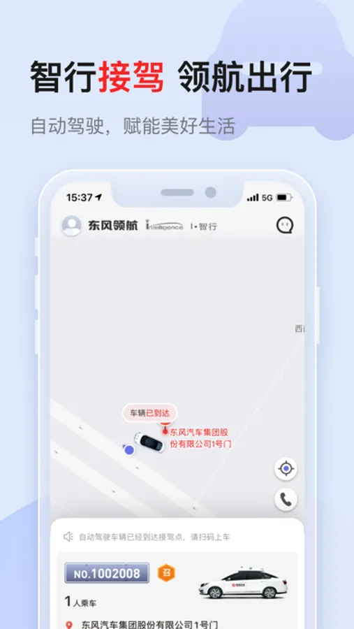 东风自动驾驶领航项目召车应用主要包含召车、评价、行程记录、预约记录、安全中心、客服中心、我的伙伴、意见反馈、隐私政策、法规条款及用户协议、账户管理等功能。