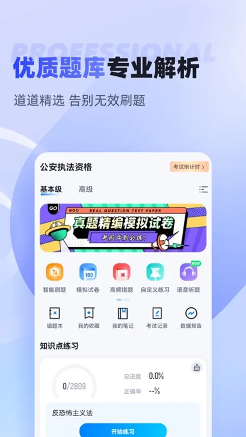 执法资格题库内含考点练习,全国通用卷以及地区卷模拟练习,以及按照固定考试比重的随机式的抽题的真题考场,成绩单实时记录考试数据,一点一滴的反馈考生近期学习状态以及自我正确率的提升,大大的给予考生通过考试的信心。