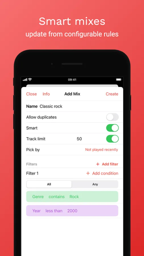 Smart mixes auto-update based on the rules that you set. Smart mixes can be created from filter conditions like genre, artist, and year. Each time you open the app, they update automatically. Create an 80's rock playlist, and when you add music to your library, the mix will update itself! You'll feel like a genius with your new smart playlist alternatives.
