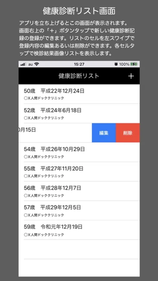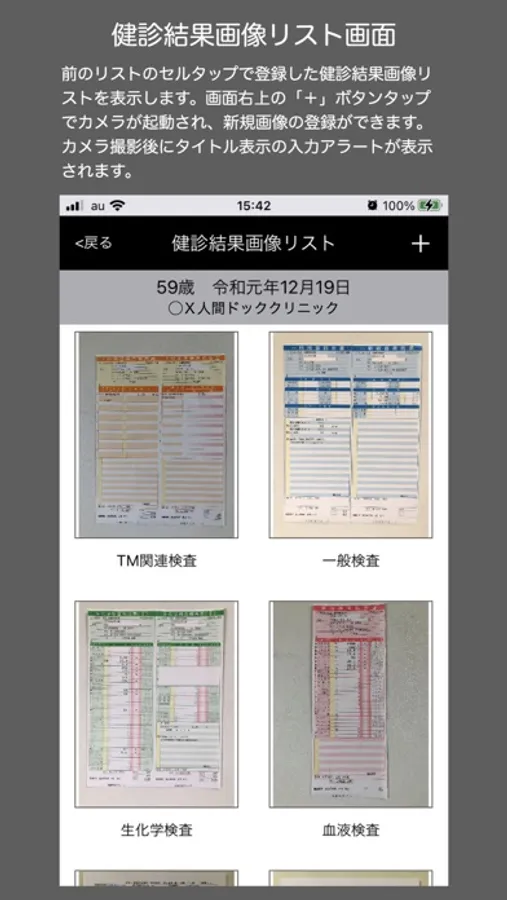 本アプリは、人間ドックや自治体で毎年行なっている健康診断などの結果を受診日単位にまとめて画像で記録しておけるアプリです。