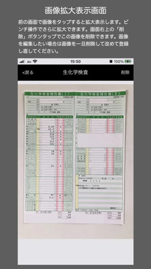 登録操作は簡単です。受診日、受診時の年齢、受診医療機関名の3つだけ。受診日を登録したら、その日に検査した結果の紙をカメラ撮影するだけ。撮影した画像は拡大表示ができますので、細かい文字の検査結果もはっきりと確認できます。病院での受診時にお医者さんから過去の検診結果を突然聞かれた時でも、素早く提示できます。