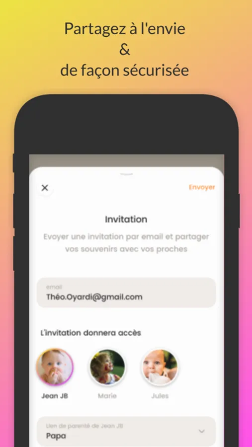 Votre compte n’est accessible que par vous et vous choisissez à qui vous souhaitez partager les souvenirs de chacun de vos enfants séparément. Vos données ne sont pas partagées à des tiers à des fins publicitaires.