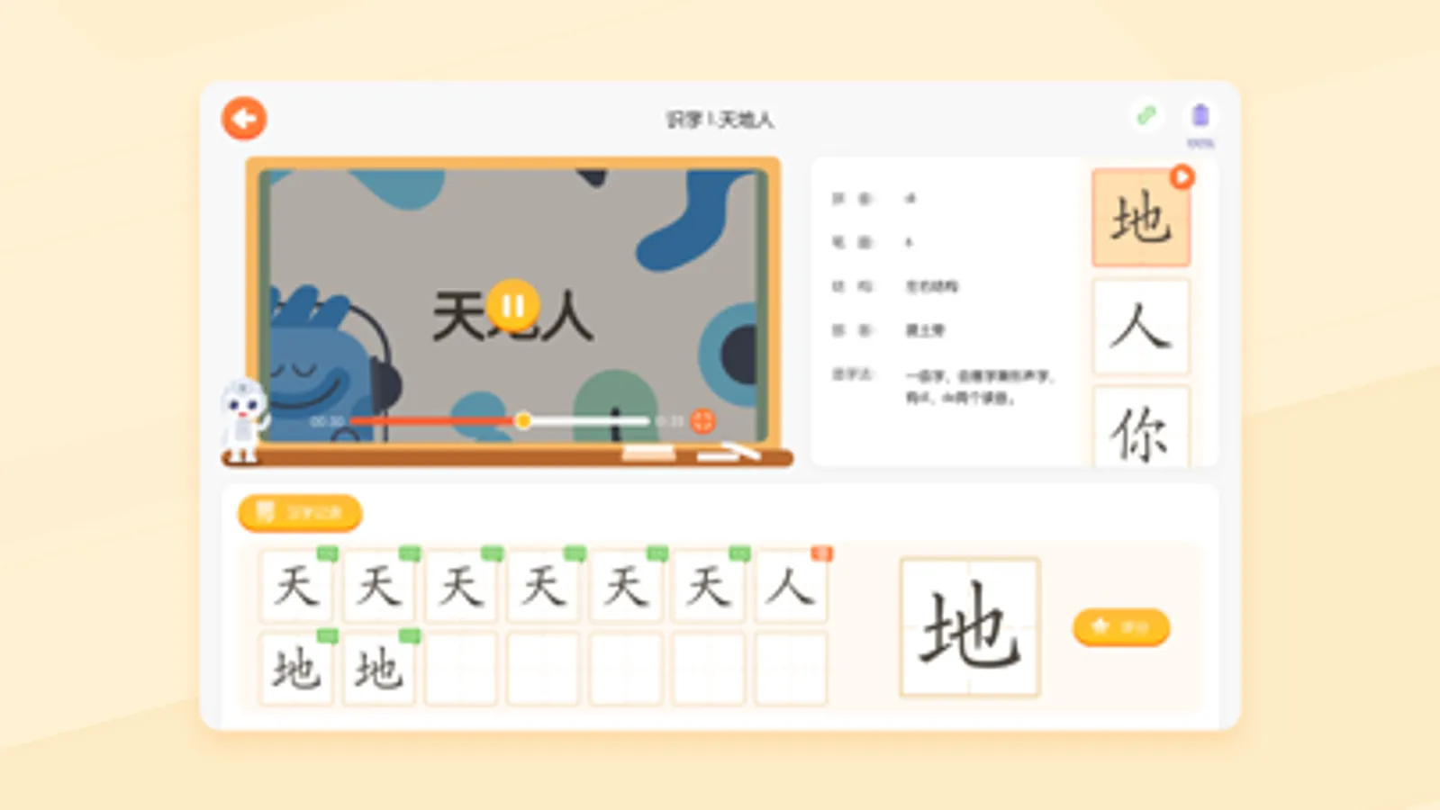 1. 教材同步:同步(部编版)《小学语文》1~6年级教材,内容全面;专业书法老师提供视频详细讲解,配套字帖与练习册随学随练;智能打分与评价纠偏系统,逐字规范学生书写习惯,引导学生写对字、写好字。