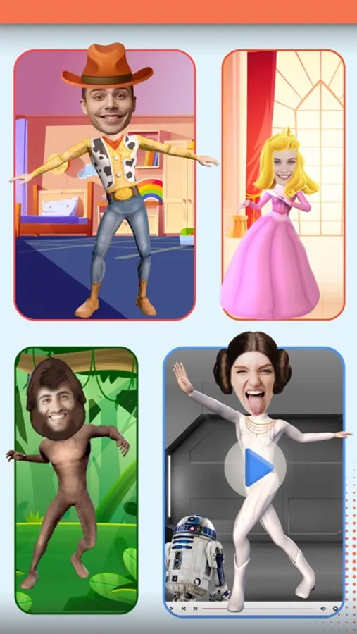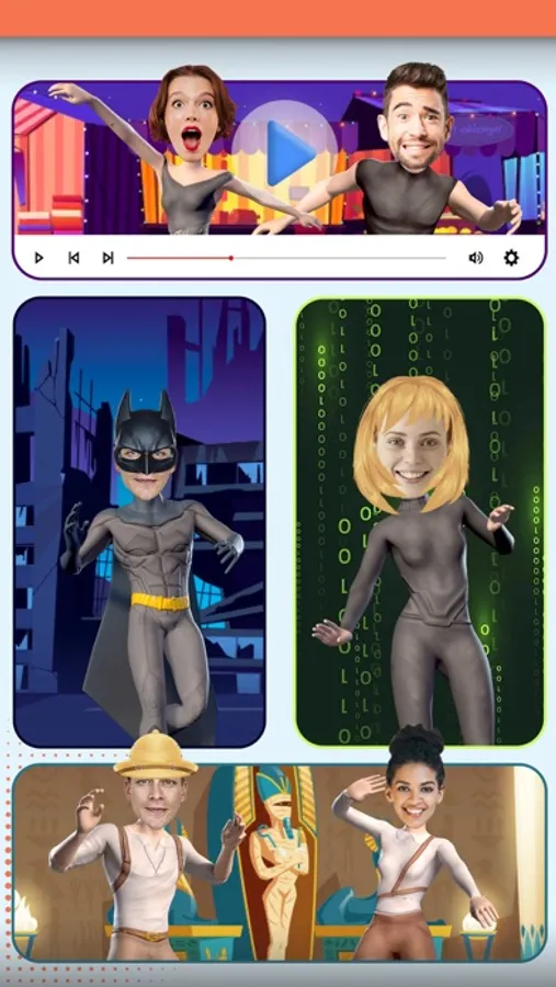 We offer you many different options to show your moves. All you need to do is to choose the theme that you like and put your face in 3D in these hilarious animations. Dance alone or dance with a friend. Create your video and share it with on your social media. They will love your videos. Come over and just dance with us!