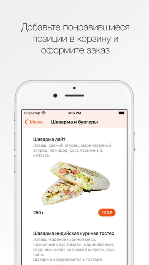 Как сделать заказ в приложении “Кормушка”: выберите понравившиеся позиции из меню, добавьте их в корзину и перейдите на экран оформления заказа (по нажатию на иконку корзины).