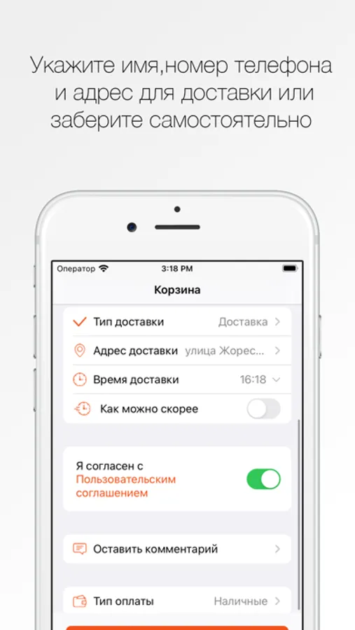 Укажите время, когда хотите прийти за своим заказом или выберите доставку с указанием времени и адреса доставки.