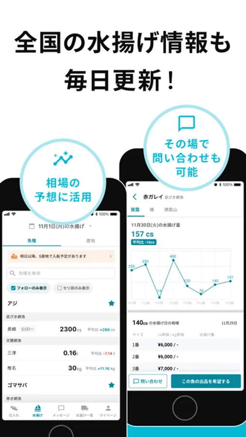 各産地市場の水揚げ魚種や数量がリアルタイムに分かり、相場の予想に活用したりその日の仕入れに活かせます。