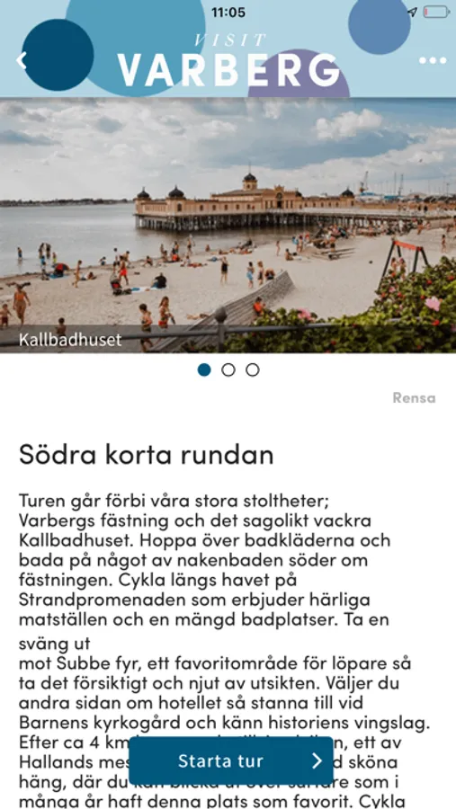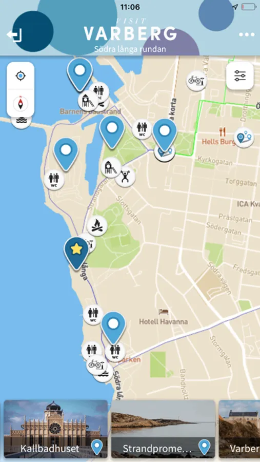 I denna app hittar du promenader och cykelturer runt om i Varbergs kommun. Du upptäcker Varbergs vackra kust och landsbygd på egen hand och väljer själv när och hur. Flera turer med olika längd finns att välja på. Du passerar förbi ett pärlband av besöksmål och mysiga platser som du hittar bilder och information om när du startat rundorna.