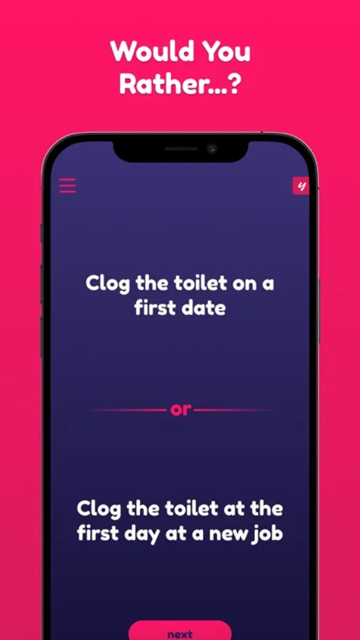 Play through hundreds (350+) of fun, embarrassing, and intriguing questions, and find out which scenarios your friends and close ones prefer! Spice up your parties by making it competitive!