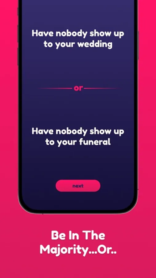 Get a bunch of friends gathered. The app will display two scenarios at the time. Everyone votes for which scenario they prefer, and the ones who vote for the least popular scenario loses!