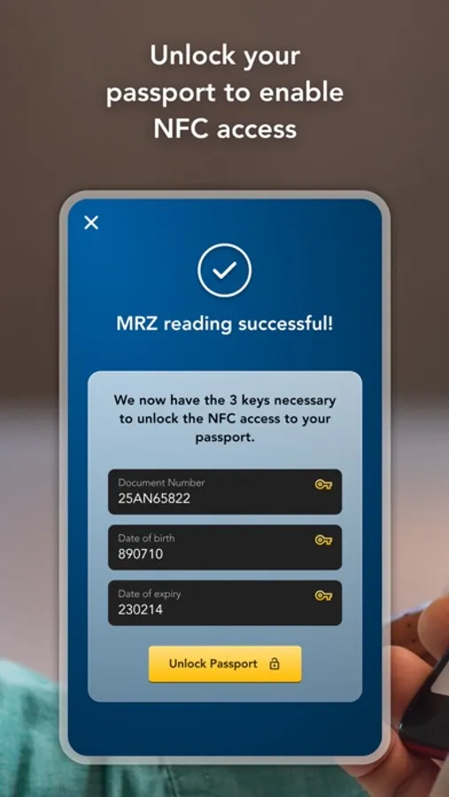 Make sure your phone is NFC ready and your passport has the chip symbol displayed, then use your phone’s camera to extract the necessary info to enable NFC access. Place the top part of your phone on your passport and let it scan your data.