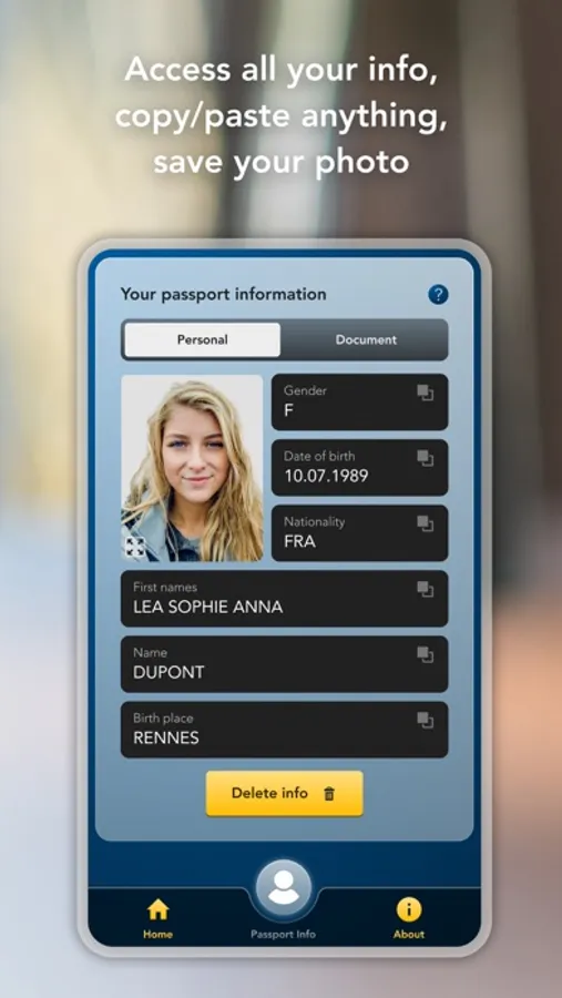 View all your info, save your photo and copy/paste any field (such as your passport number). Please note that some data (such as your finger prints or iris photo) can only be read by official authorities.