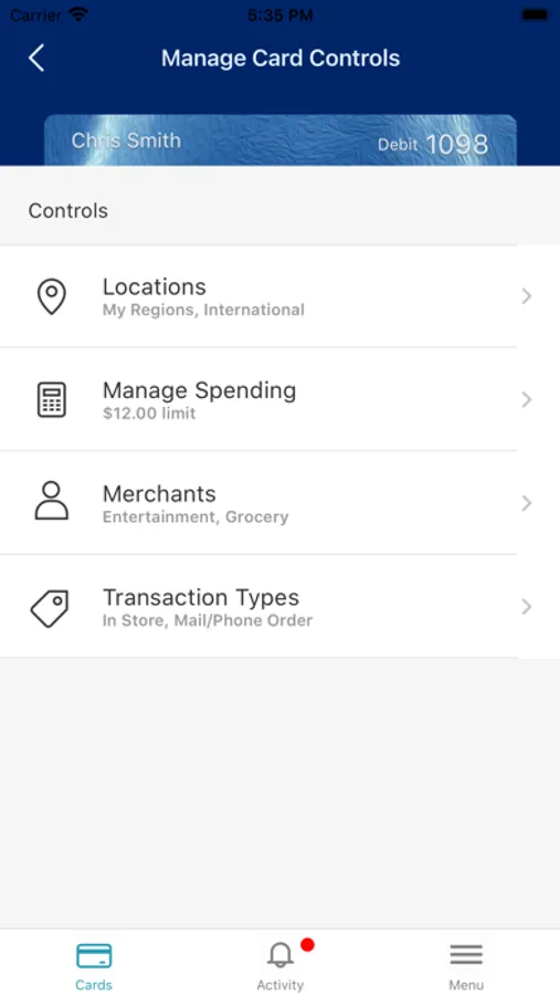 Spending limits can be established to allow transactions up to a certain dollar value and decline transactions when amounts exceed your defined thresholds. Transactions can be monitored and managed for specific merchant categories such as gas stations, department stores, restaurants entertainment, travel, and groceries. And your transactions can also be monitored for specific transaction types: in-store purchases, e-commerce transactions, mail/phone orders and ATM transactions.