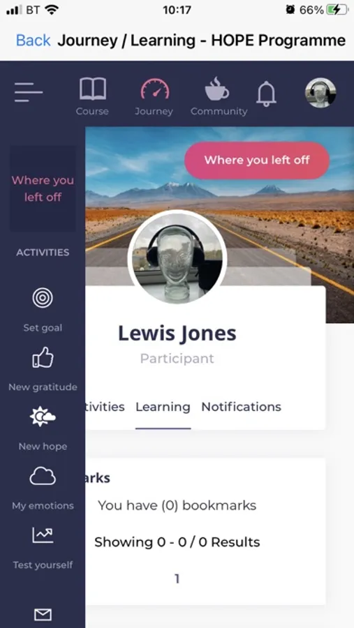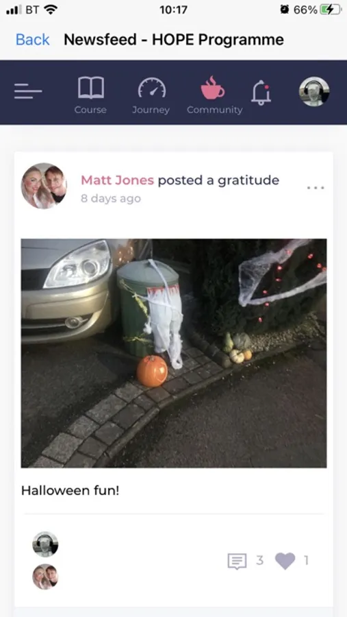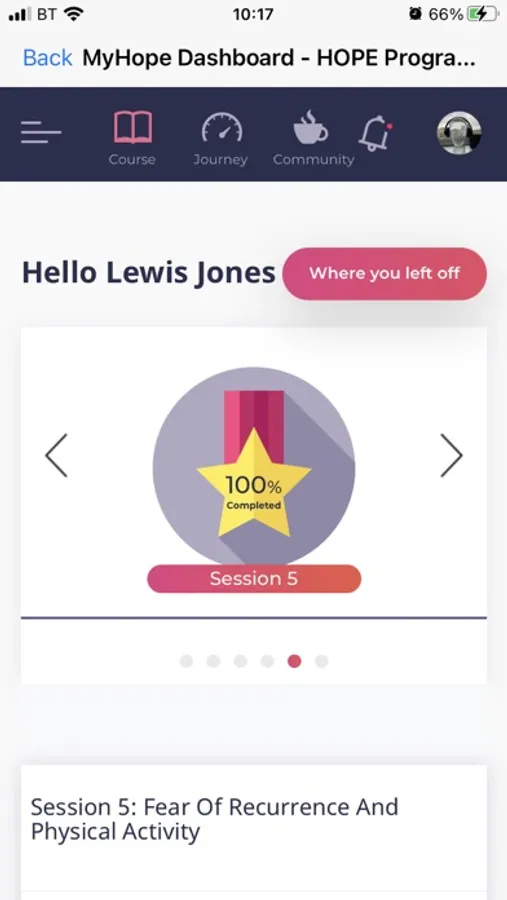 Meet others in the same situation and try a range of interactive activities including goal setting, gratitude, hope for the future, mood, activity and symptoms tracking, journaling and an online forum.