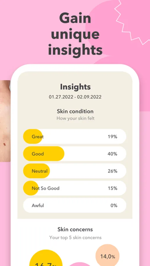 - Track how cosmetics, water intake and sleep duration influence your skin condition