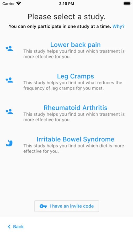 The StudyU Health app is part of the StudyU platform, together with the StudyU designer. With the StudyU designer, scientists are given a web application to digitally specify, publish, and conduct N-of-1 trials. The StudyU app is a smartphone application with innovative user-centric elements for participants to partake in the published trials and assess the effects of different interventions on their health. Thereby, the StudyU platform allows clinicians and researchers worldwide to easily design and conduct digital N-of-1 trials in a safe manner. StudyU has the potential to change the landscape of personalized treatments both for patients and healthy individuals, as a free collaborative tool for researchers, and as a tool that can be integrated in clinical practice.