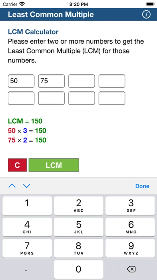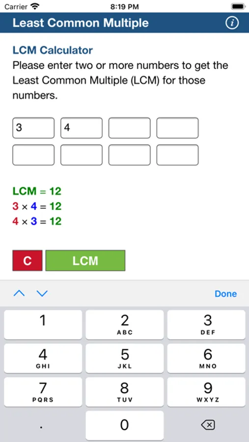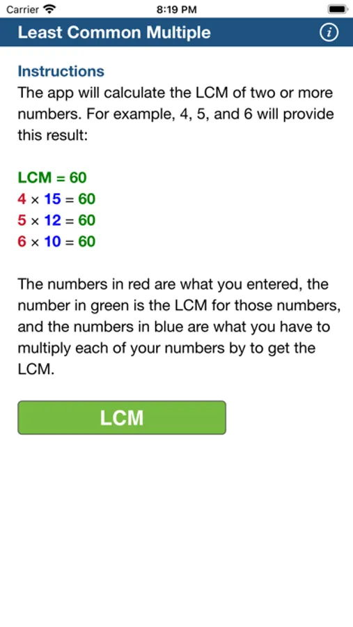This app will not only find the LCM of your numbers, but it will also calculate the multiplier you need to multiply each number by to get the LCM.
