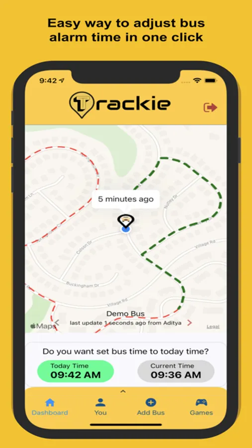 Create Bus and the intelligent and self-adjusting alarm will help you reach on time for the school bus. Trackie keeps track of previous bus arrival times and intelligently adjusts the bus time for you.